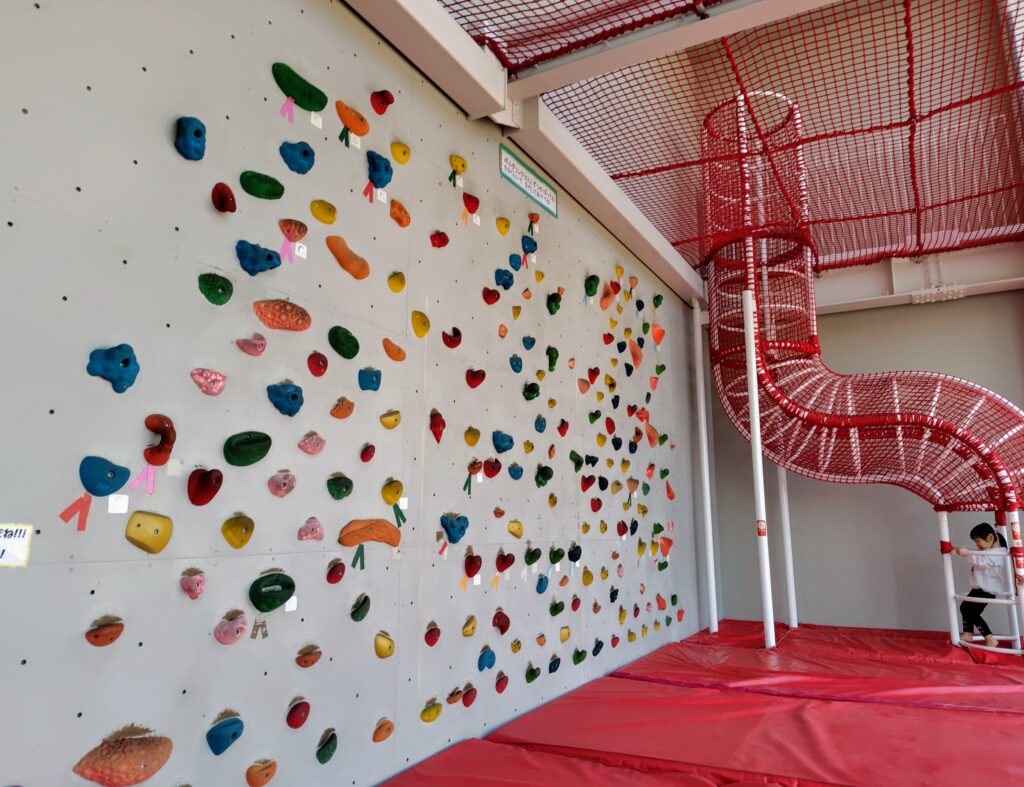 立派なボルダリングのコーナーもあります。私たちは室内遊びだけ利用しましたが、屋外にも立派な遊具や、バランスバイクなどの乗り物貸出し(有料)もやっています。土日にはボーネルンドのマット遊具(有料)でも遊べるなど、色んな年齢の子どもが楽しめる施設です。