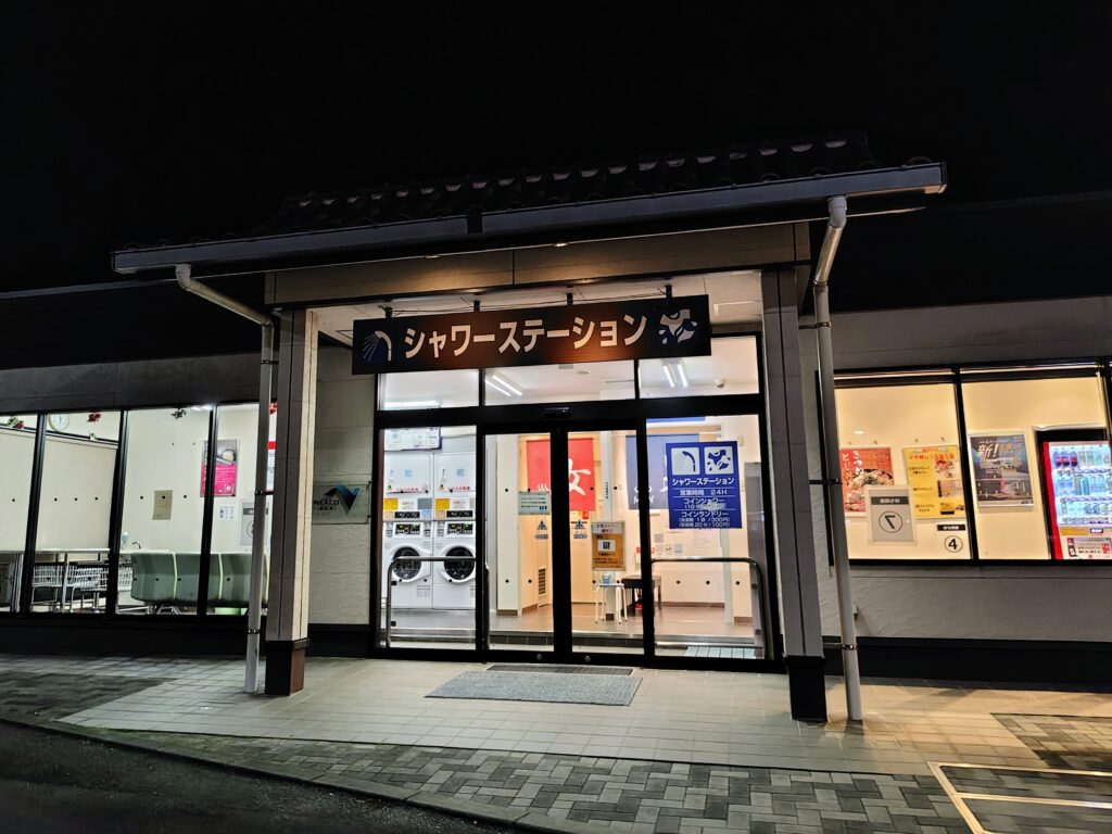 大阪入りを前に、最後の夜はパーキングエリアで。ここはシャワーがあるのが最大の魅力! 女性用は入口に鍵があり、完全入れ替え制なのでセキュリティも安心です。鍵は売店で受け取り、1時間以内に退出がルール。ちなみに男性用は、3ブースありで鍵なしでした。