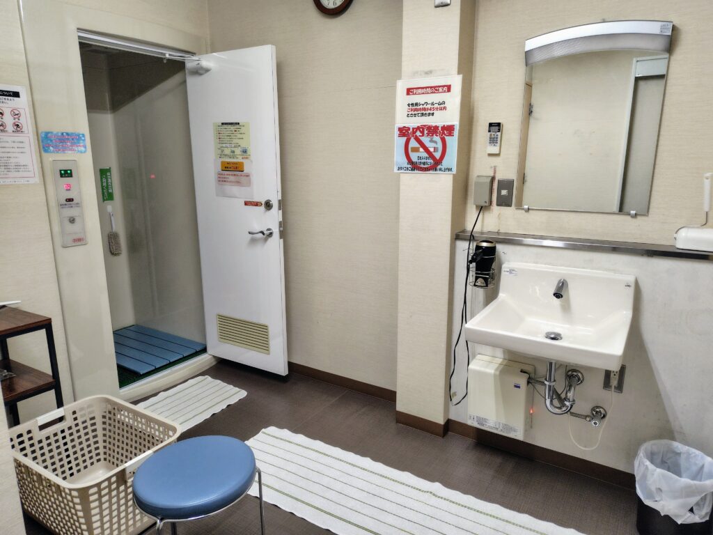 シャワー料金は10分300円ですが、お湯を止めている間はカウントされないので、4歳のわかなと一緒に入っても余裕で足りました。アメニティはないので、シャンプーなどは持参してください。